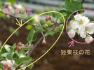 ナシは腋花芽の花にも人工授粉をして果実をならせます。リンゴでは、腋花芽(二年枝の花芽)に果実をならせません。果実が大きくならないので蕾のうちに摘み取ります。