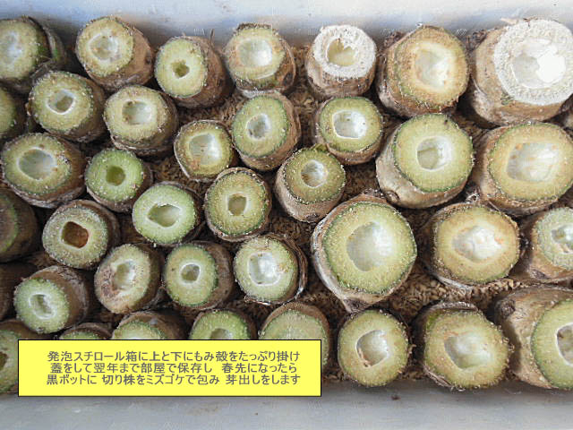 発泡スチロール箱に上と下にもみ殻をたっぷり掛け蓋をして翌年まで部屋で保管し部屋で春先になったらポリポットに切り株をミズゴケで包み芽出しとします。