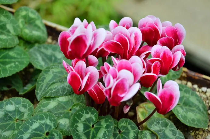 シクラメンの開花は冬が本番です。寂しい冬の庭を華やかにしてくれる存在として、ガーデニングで活躍します。ただし、シクラメンは耐寒性が強いわけではありません。地植えにすると寒さに耐えられず、枯れてしまうことがあります。基本的には鉢植えにして、真冬の間は室内に取り込みましょう。