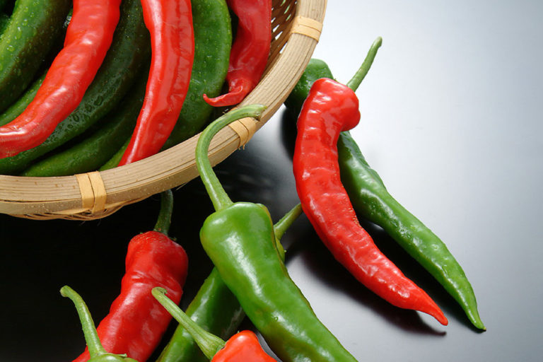 青トウガラシのときは辛味成分の値(カプサイシノイド含量2.86mg/100g当たり)が少なく、赤トウガラシになるにつれ値(カプサイシノイド含量82.8mg/100g当たり)が大きくなっていきますが、鷹の爪の辛味成分の値(カプサイシノイド含量301.2mg/100g当たり)に比べるとかなり低く、甘みを含んだまろやかな辛味と香りの良さが特徴です。