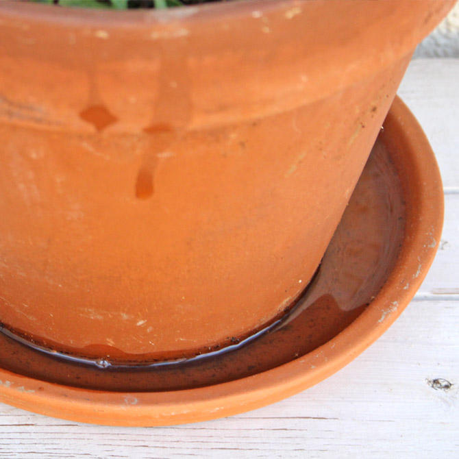 鉢下にあふれた水は、そのままにしておくと過湿の原因になりやすいので、水が空になった状態の鉢皿に乗せましょう。