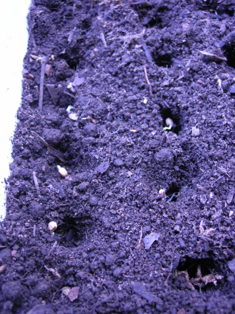 じっくりと熟成させた土を入れ、深さ5cm程度の穴を開けて、種を植え込みます。