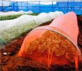 赤―黒ネットは太陽光を妨げる可能性があるため、赤―赤ネットを基に、防虫ネットを開発。亀岡市内のほ場で実験したところ、ネットをかぶせない場合に比べ、側面を赤色ネットで覆っただけでも侵入を約2分の1に抑制することが確認された。
