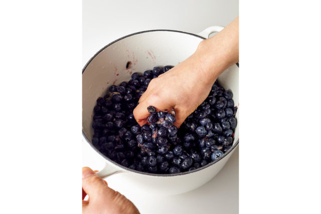 洗ったブルーベリーはザルにあげて水気をきり、鍋に入れ、手のひらで軽く握るようにして果肉をつぶす。こうすると早く果汁が出て、グラニュー糖が溶けやすくなる。