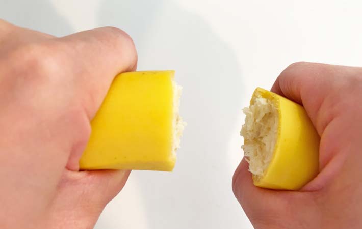 この裏技は、バナナを皮付きのまま両手で握り、左右に引っ張るだけ。