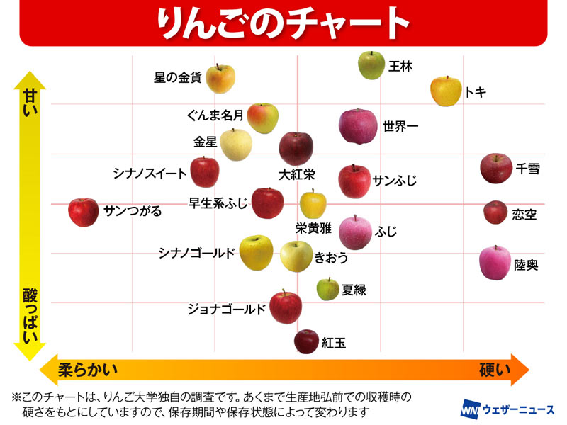 このチャートは甘さと酸味のバランスに加え、好みがわかれる硬さや柔らかさの食感を表していて、早生系ふじを基準にりんごをチャート化したものです。