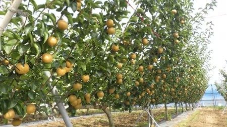 梨狩りにいったときの風景を思い出すと、広い敷地に大きな木が育っていて、人の背丈より少し高い棚いっぱいに枝が巡らせてあって、そこに葉が茂り、実がぶら下がっている——というのが普通だと思う。写真1は、このような伝統的な方法で栽培している梨だ。木1本が覆う面積は50平方メートルから100平方メートルにもなる。