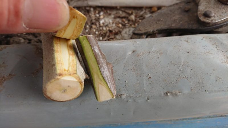 形成層が分厚いので、形成層を全面に出して接いでいたら、親から「ある程度木の部分も出した方が良い」と言われたので、木部が出る様に割って接木する。