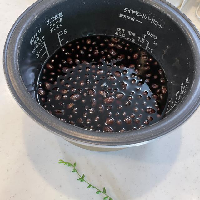 炊飯器の内釜に1を入れて平らにならし、おかゆモードで炊飯する。炊きあがったら黒豆のかたさを確認し、黒豆がかたい場合は保温モードで1〜3時間おく。