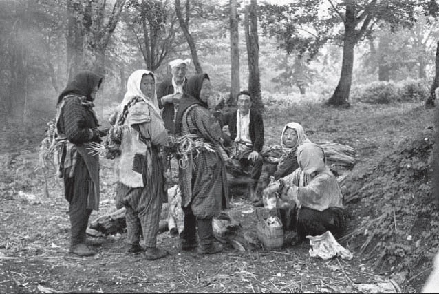 具体的には、主に春先から秋にかけて集落近くの山野から採取する、ゼンマイ、ワラビ、ミズ、フキ、ヨモギ、ボンナ、コゴミ、タラッポ、アザミ、ミズタガナ、ウツギの若芽、シドケ、セリ、ソデコ、バッケ、フクベラ、ミツバ、ヒロコ、カタクリ、アサヅキ、ウルイ、ボウフウ、ウド、ワサビ、ホドイモ、ジネンジョ、ユリの球根、タケノコ等の山菜である。それらを自ら加工して家庭で食べてきた。キノコ類についても同様であったという(7)これらは個人消費目的で山菜を採取している活動であるといえよう。これに対して写真の一行は、大きな包みを棒はかりで軽量したり、リヤカーやトラックに搭載したり、寝泊りする簡易な小屋も建てているところから、集団による生業としての採取だったと推測される。