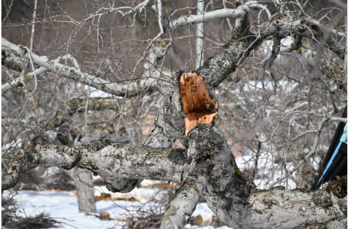 雪は融けるにつれて水分を含んで密度を高め、重さを増す。ざらめ雪の重量は新雪の最大10倍となり、1平方メートル当たりの負荷は500キロになるという。樹の最上部付近まで雪に埋もれた場合、根元にかかる総重量は1台1トンの軽トラック数台分に相当する計算だ。いかに風雪に耐えてきた樹であってもひとたまりもなかったと考えられる。
