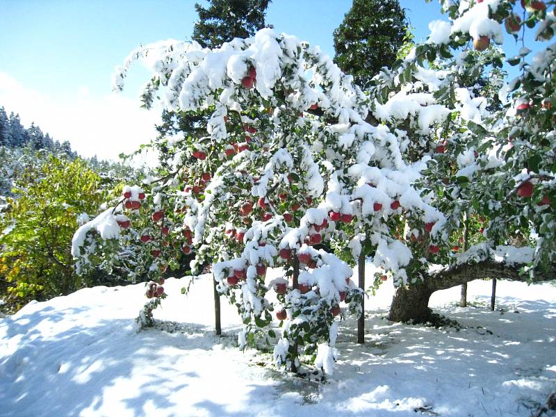 となりの園地では雪の重みで折れそうな木が何本もあります。